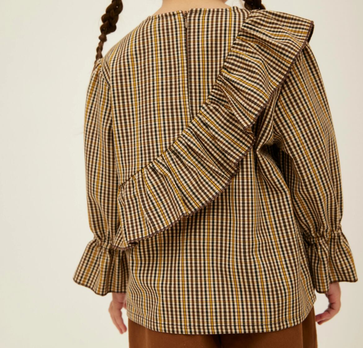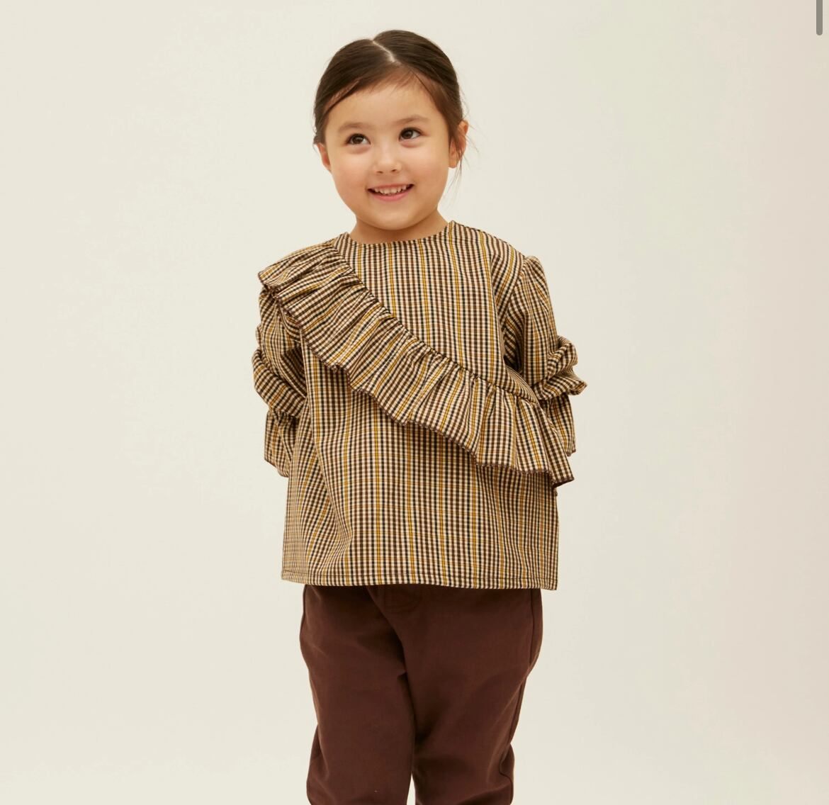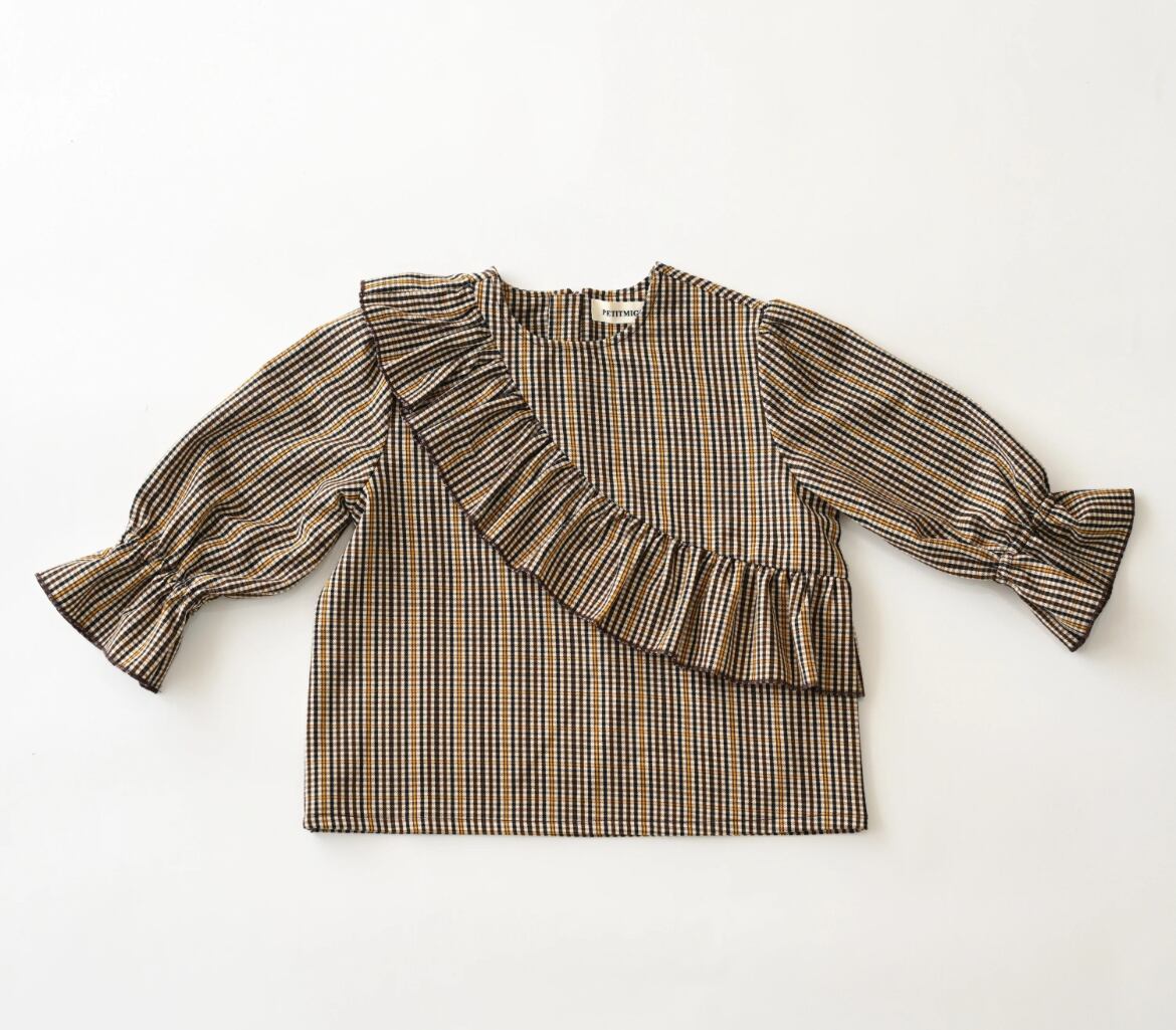 大胆な斜めフリルが目を引く、おしゃれ度アップのブラウス